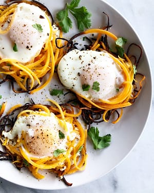 - Add butternut squash noodles and form into little nests. Put the lid on and let steam for 2 min.
