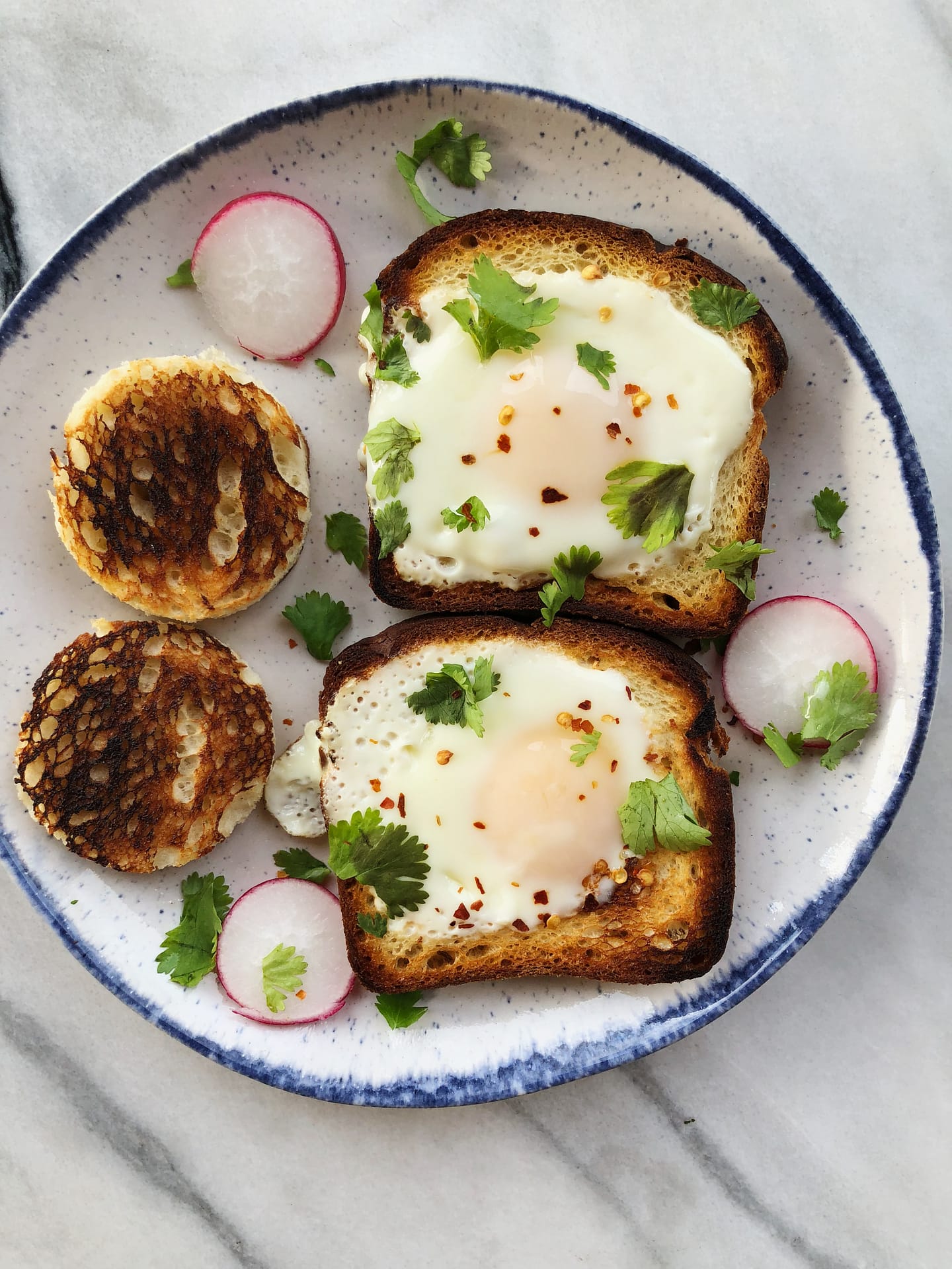 - Don’t forget to add the cut out circles to the pan while the eggs cook.