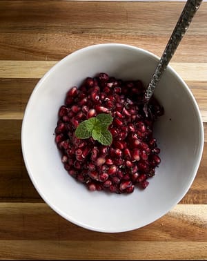 I thank my Persian husband for this recipe. I've always love pomegranate but the first time I had a bite of it prepared this way - MY LIFE CHANGED. There is something about the way the mint and sea salt bring out the sweetness of the pomegranate that just makes it POP! Make this for a sweet treat or appetizer when you have guests over and they will surely be impressed. Best part is - its really really easy!